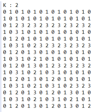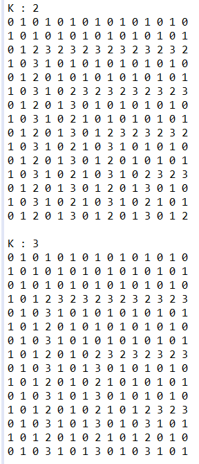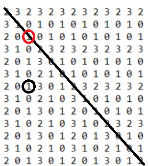 그리고 (i, i)를 기준으로 오른쪽과 아래 방향으로 010101... 또는 232323... 또는 101010... 이 반복된다는 사실을 알 수 있습니다.