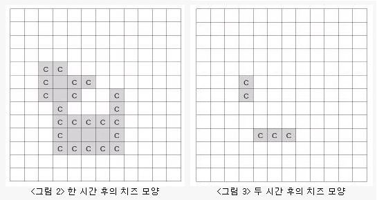 이 치즈를 공기 중에 놓으면 녹게 되는데 공기와 접촉된 칸은 한 시간이 지나면 녹아 없어진다. 치즈의 구멍 속에는 공기가 없지만 구멍을 둘러싼 치즈가 녹아서 구멍이 열리면 구멍 속으로 공기가 들어가게 된다. <그림 1>의 경우, 치즈의 구멍을 둘러싼 치즈는 녹지 않고 ‘c’로 표시된 부분만 한 시간 후에 녹아 없어져서 <그림 2>와 같이 된다.