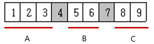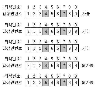 예를 들어서, 그림과 같이 좌석이 9개이고, 4번 좌석과 7번 좌석이 VIP석인 경우에 <123456789>는 물론 가능한 배치이다. 또한 <213465789> 와 <132465798> 도 가능한 배치이다. 그러나 <312456789> 와 <123546789> 는 허용되지 않는 배치 방법이다.
