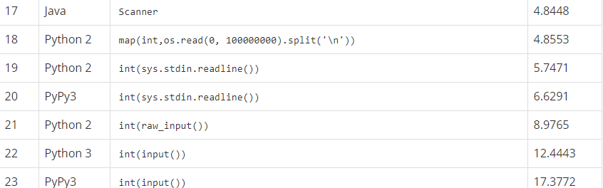 반면, Scanner를 사용하면 BufferedReader에 비해 약 8배 정도 느리다는 것을 알 수 있습니다. 참고로 이 표를 보면, 파이썬도 꽤나 느린 언어라는 것을 짐작하실 수 있을겁니다.