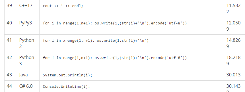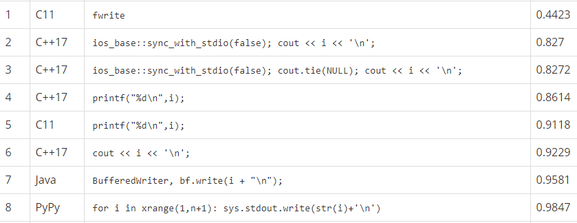 여러가지 언어와 출력 방법을 이용해서 시간이 얼마나 걸리는지 비교해 보았습니다. 방법: 총 N개의 줄에 1부터 10,000,000까지의 자연수를 한 줄에 하나씩 출력하는 시간을 측정. 10번 측정해서 평�