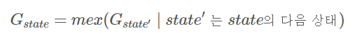 또한, 다음 상태를 고려하여 그런디 수를 구해야 하는데, 그런디 수는 mex를 이용하여 구할 수 있습니다.