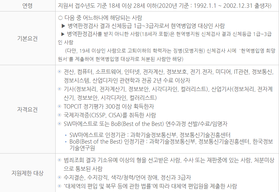 또한, 자격 요건은 SW 관련 학과 2년 수료하거나 위에서 언급한 기사, 산업 기사, TOPCIT, 국제자격증 중 하나를 취득하거나 SW마에스트로 or BoB 과정을 이수하였으면 됩니다.