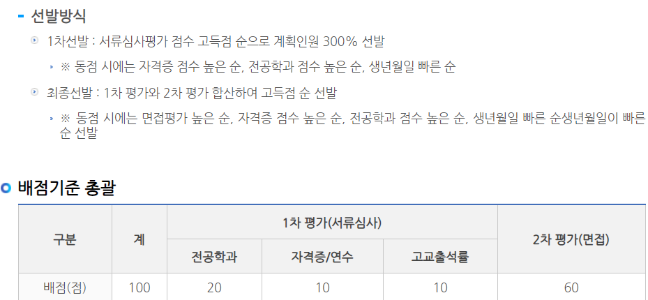 선발은 1차와 2차가 있는데, 1차는 서류 심사 평가를 통해 3배수를 뽑고, 2차는 면접 평가를 진행한 후 최종 합격자를 발표합니다.