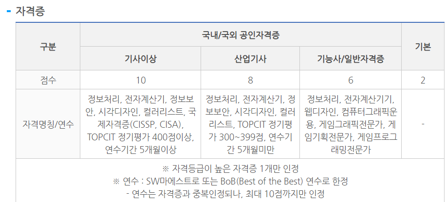 아니면, SW마에스트로나 BoB를 수료하셨다면, 자격증은 따지 않으셔도 무방합니다.