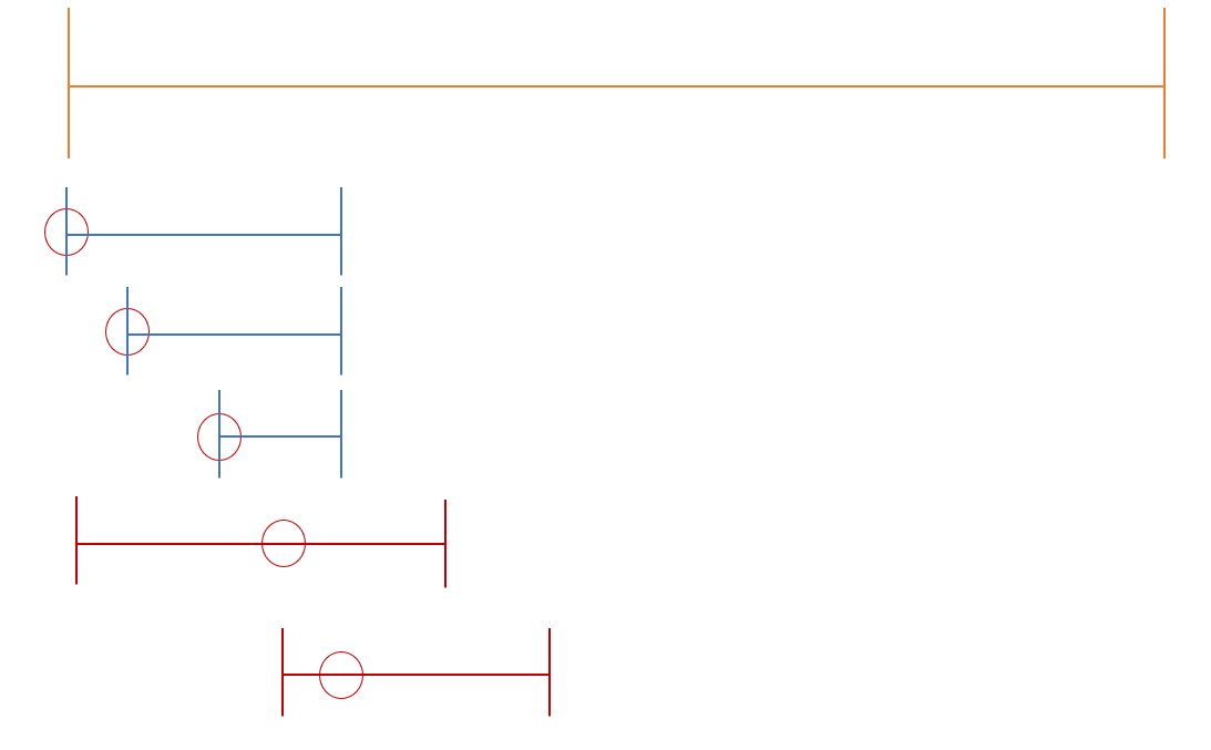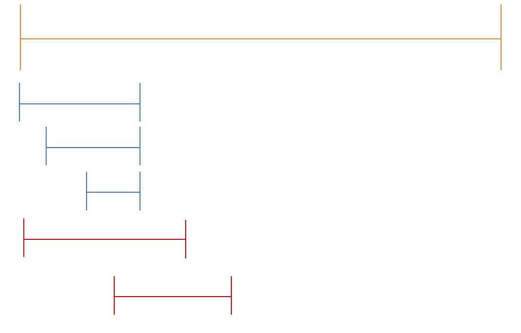 맨 위에 긴 주황 선은 전체 1 ~ N번까지의 전체 범위를 나타냅니다. 이 부분은 실제로 입력값으로 주어진 범위는 아닙니다.