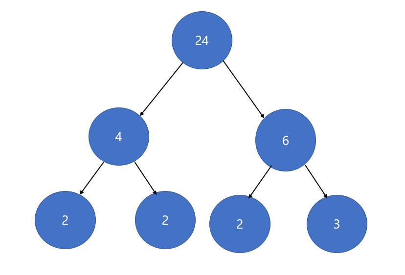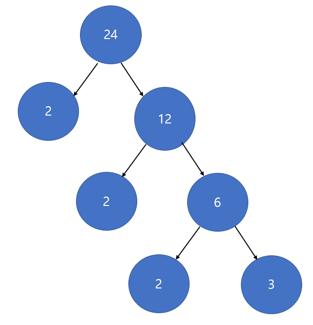 24를 소인수 분해하였을 때, 2가 3개, 3이 1개가 나오는데 이것은 모두 자식 노드가 없는 리프 노드에 해당합니다.
