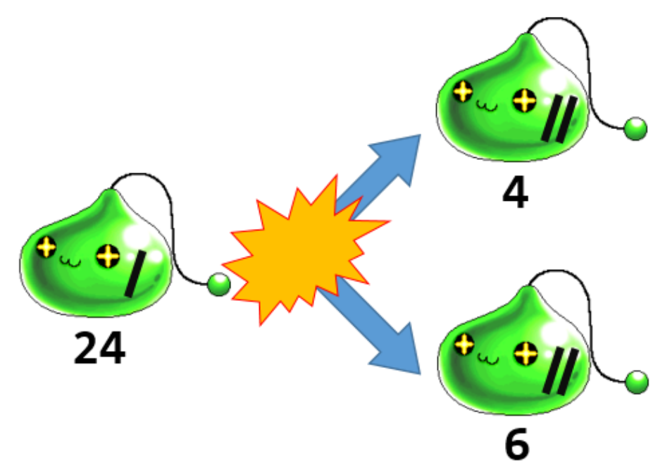 에너지가 24이고 흠집이 1개인 슬라임을 분할한 모습. 에너지가 4이고 흠집이 2개인 슬라임과 에너지가 6이고 흠집이 2개인 슬라임으로 분할되었다.