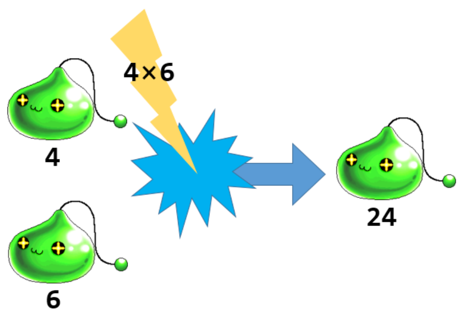 에너지가 4인 슬라임과 에너지가 6인 슬라임을 합성한 모습. 4 × 6의 전기 에너지를 사용해 슬라임 에너지가 24인 슬라임이 합성되었다.