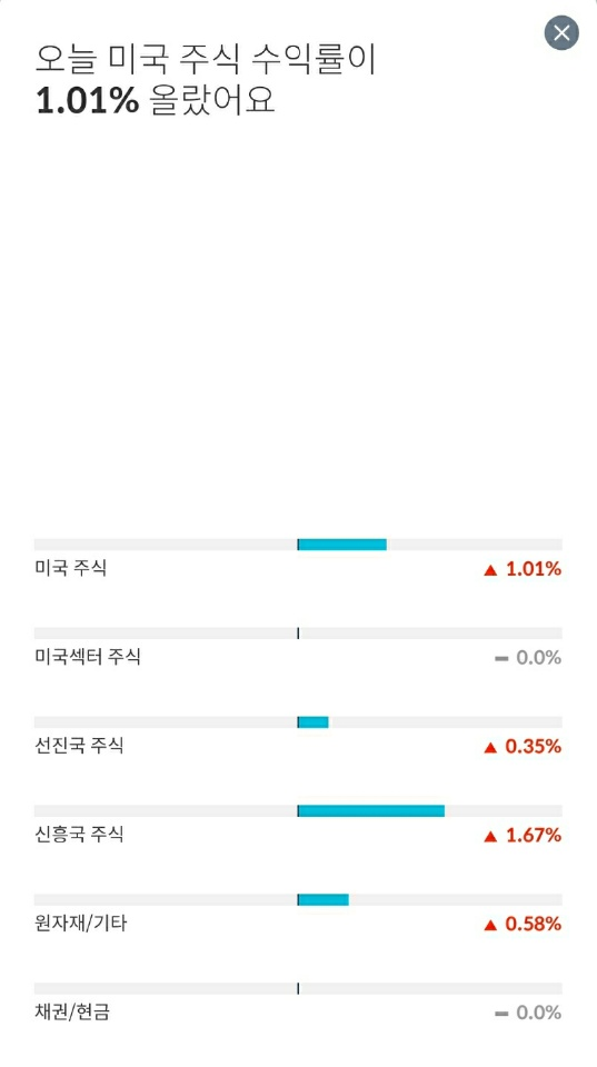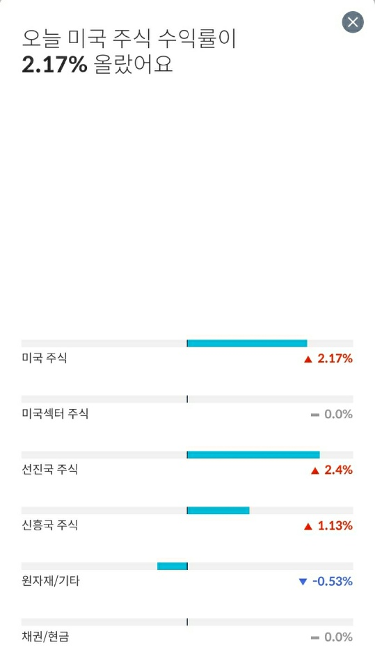 모두 빨간불로 상승장을 맞이하였는데, 특히 미국 주식과 신흥국 주식에서 많이 올랐습니다.