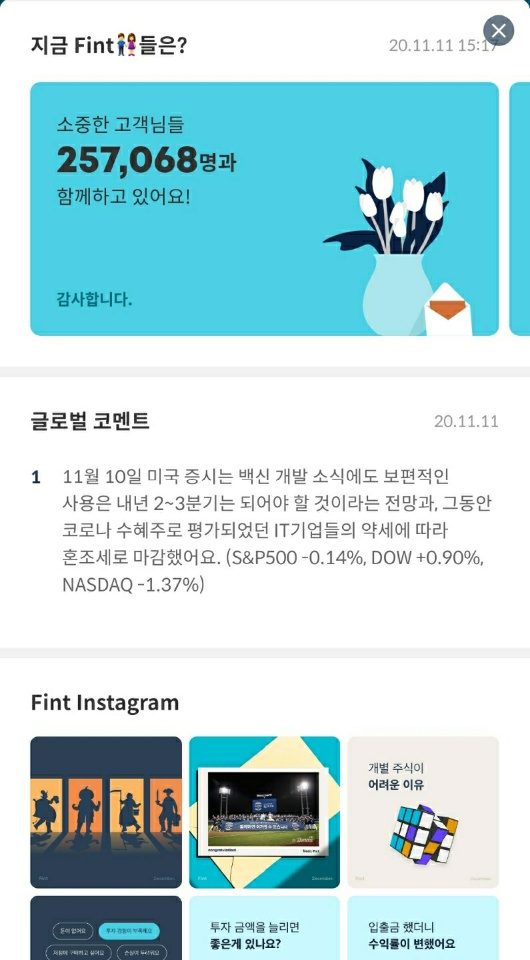 | [Fint] 핀트 투자 후기 및 일지 (42일차) (2) | 2020.11.22 |