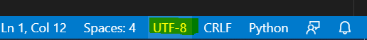먼저, 제 초기 vs code 인코딩 옵션은 UTF-8 이었습니다. 이것은 아래 사진에 나와있듯이, 우측 하단에서 확인할 수 있습니다.