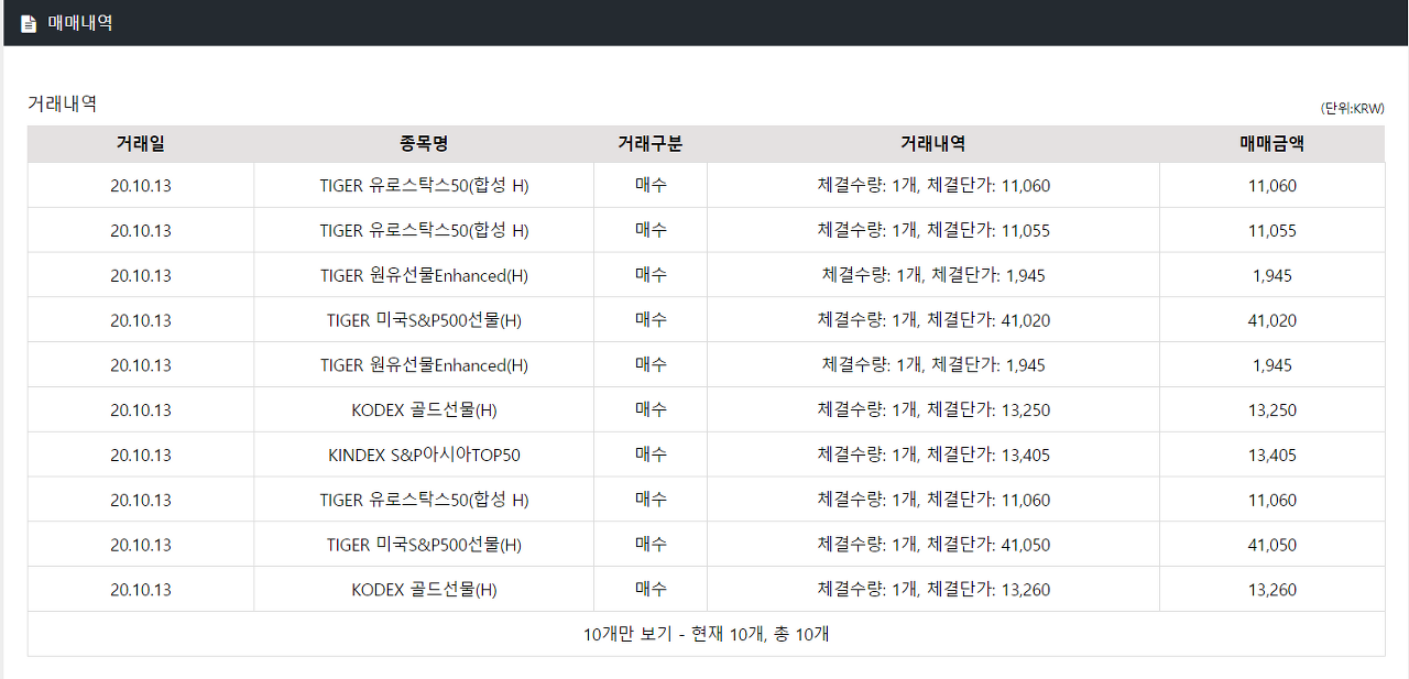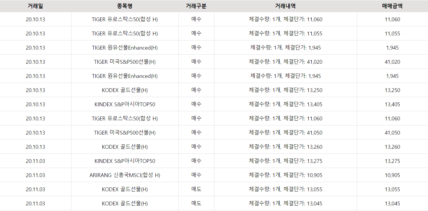 저는 KODEX 골드 선물(H)를 13250원, 13260원 총 평균 단가 13255원의 2개를 매수하였는데, 평균 13050원에 2개 모두 매도하였으니 약간의 손실이 발생하였네요.