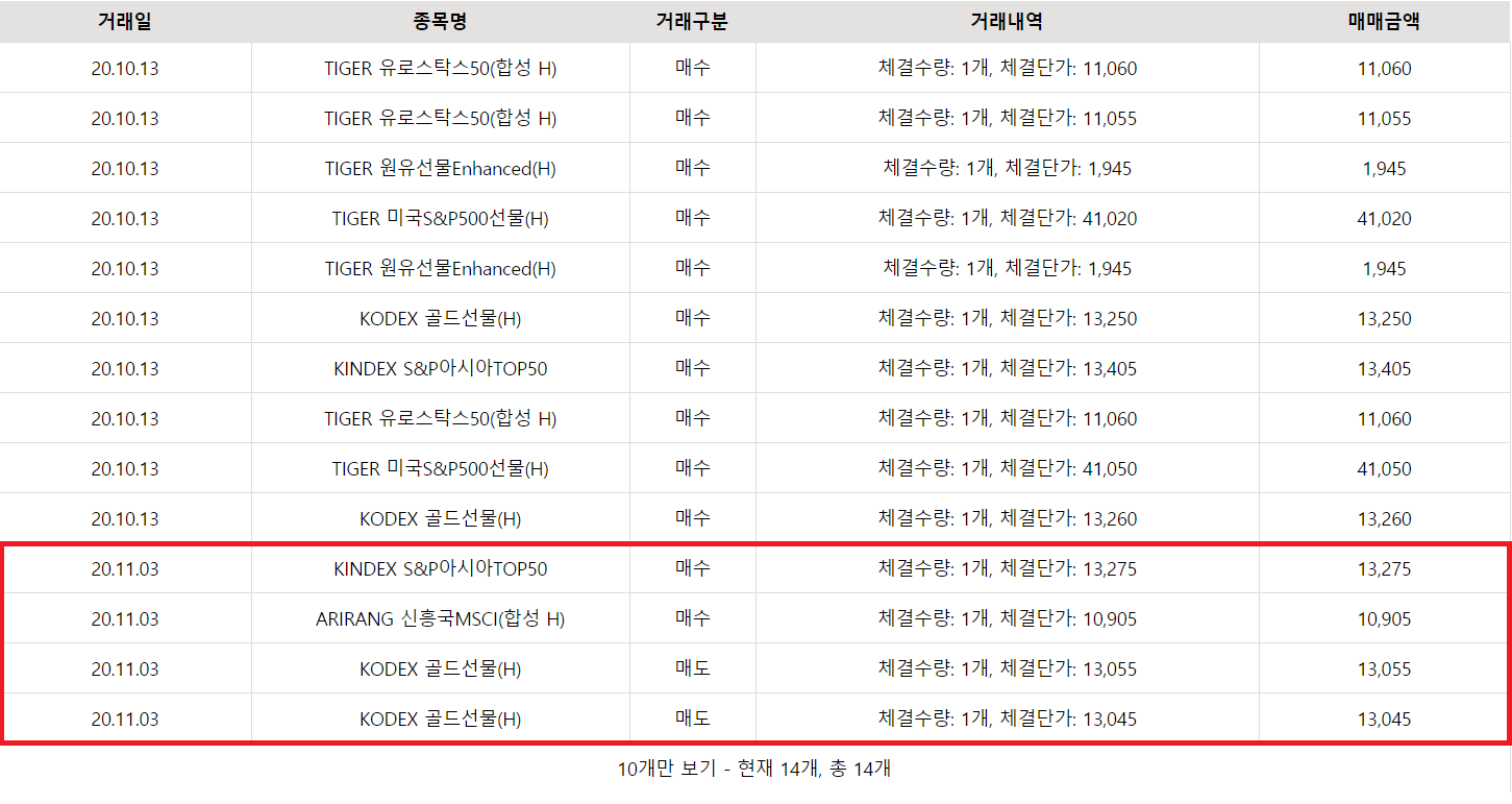 매매 기록 하단 빨간색 네모 박스를 보면 신흥국 주식 2개를 매수하였고 금 주식을 매도하였다고 나와있습니다.
