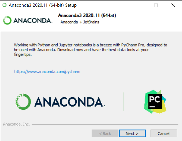 설치가 완료되고 [Next]를 누르면, 파이참 광고가 뜨는데 그냥 [Next]를 눌러서 넘어가주시고 마지막에 [Finish]을 클릭하시면 아나콘다 설치는 최종적으로 끝납니다.