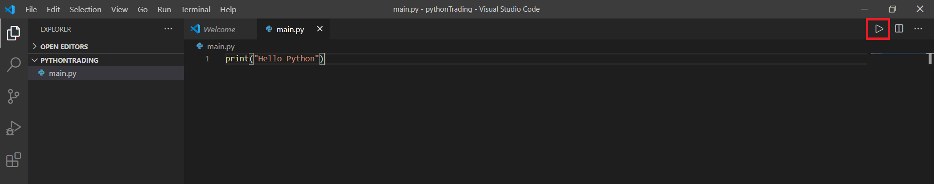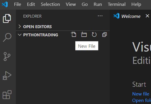여기서 왼쪽에서 2번째 아이콘인 New File을 눌러서 main.py를 생성합니다.