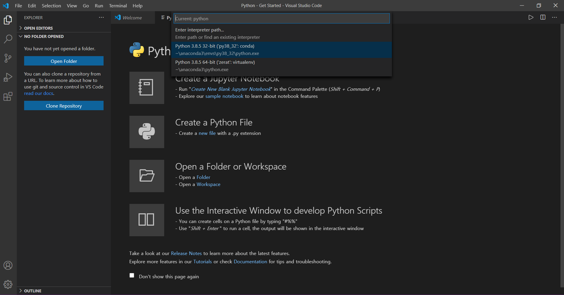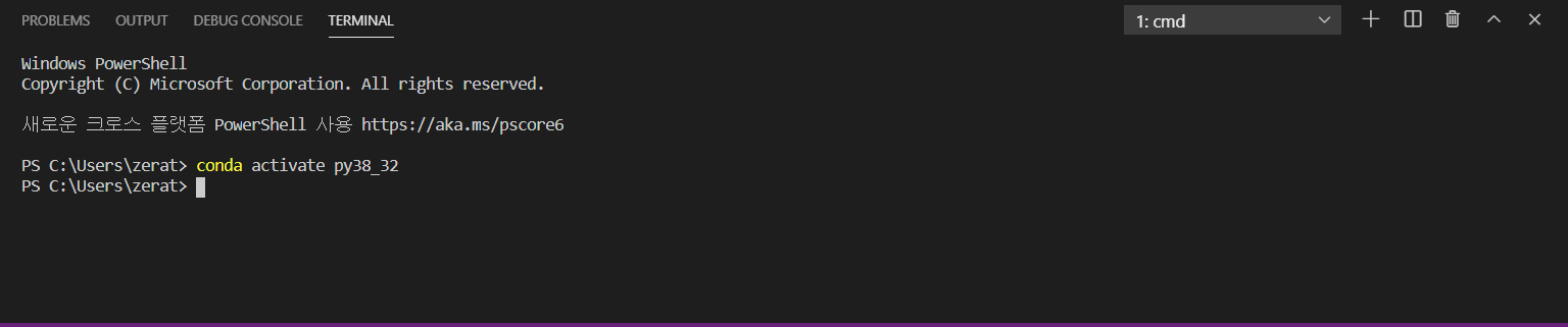 터미널 창에서 conda activate py38_32가 실행되면 성공적으로 아나콘다와 연동한 것입니다.