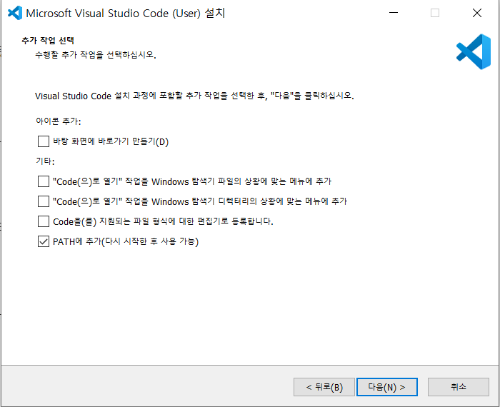 설치에 대해서는 딱히 할 말은 별로 없고, 맨 아래 PATH에 추가정도만 체크해 주시고 [다음] 눌러서 설치해 주시면 됩니다.