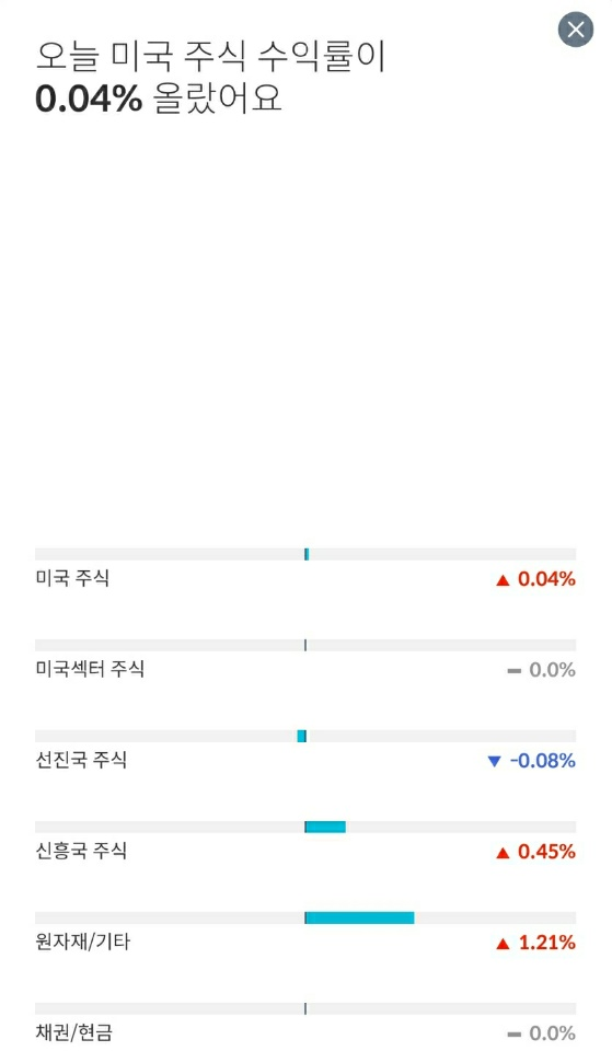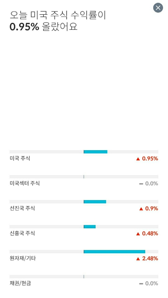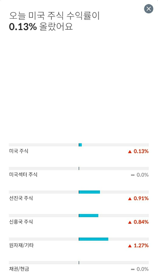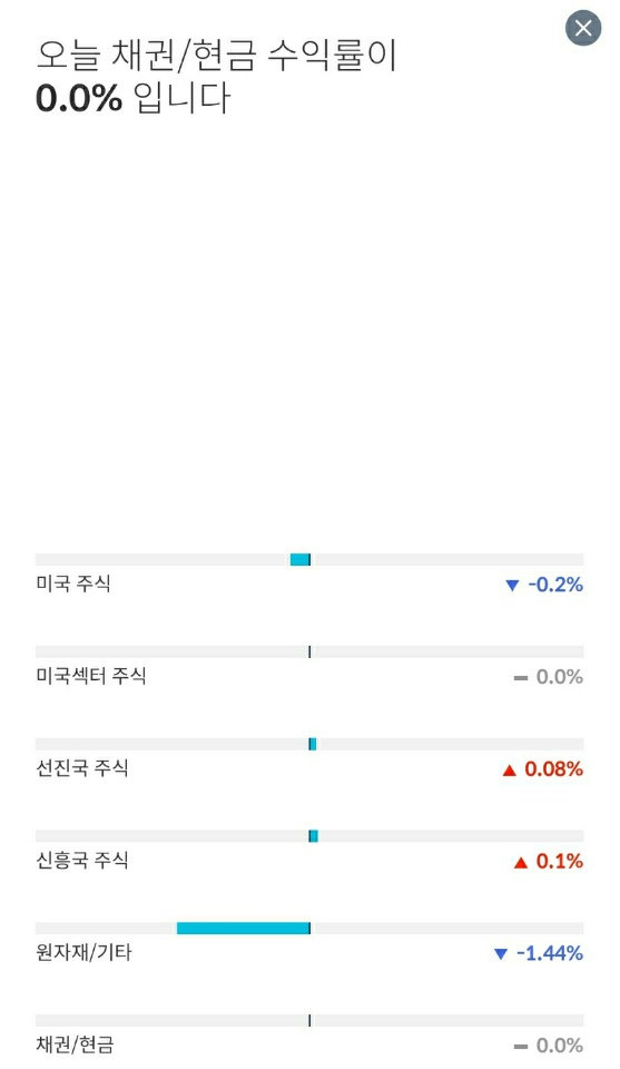 실제로 미국 주식은 거의 변화가 없고, 선진국 주식은 소폭 하였네요. 반대로, 신흥국 주식과 원자재/기타의 상승으로 인하여 전반적으로 수익률이 올라간 모습이었습니다.