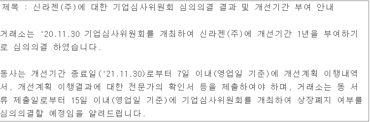 하지만, 오늘 오후 6시 10분경 전자 공시에서 신라제 관련 글이 올라왔습니다. 결론부터 이야기하자면, 신라젠은 당장 상장 폐지는 모면하였고, 1년 뒤에 다시 상장폐지 여부를 심의의결하기로 하였습니다.