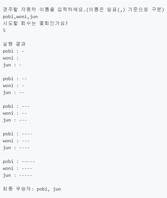 처음 경주할 자동차 이름들을 입력 받고, 시도할 횟수를 입력 받습니다.