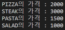 제가 레스토랑에 왔다고 해 봅시다. 여기에는 메뉴를 보니 피자, 스테이크, 파스타, 샐러드가 있었고, 각각 가격이 2000원, 3000원, 1500원, 1000원이었습니다. 아주 싸죠?