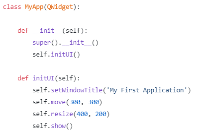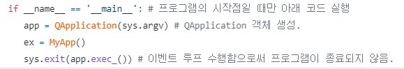 그리고 app은 QApplication 객체를 생성하는 것이고, ex는 사용자 정의 클래스인 MyApp 객체를 생성하는 것입니다. 마지막으로, app.exec_()가 중요한데, 이것은 이벤트 루프를 의미합니다.