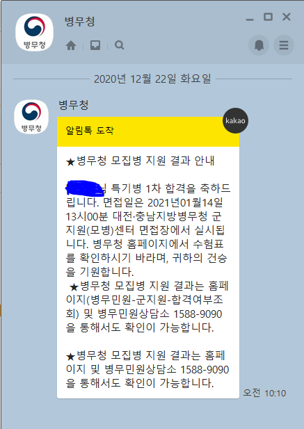사실, 저는 합격 날짜가 오늘인 것은 알고 있었으나 몇 시에 발표가 나는 지는 모르고 있었습니다. 그런데 웬 병무청에서 카톡온 것을 보고 확인하였죠.