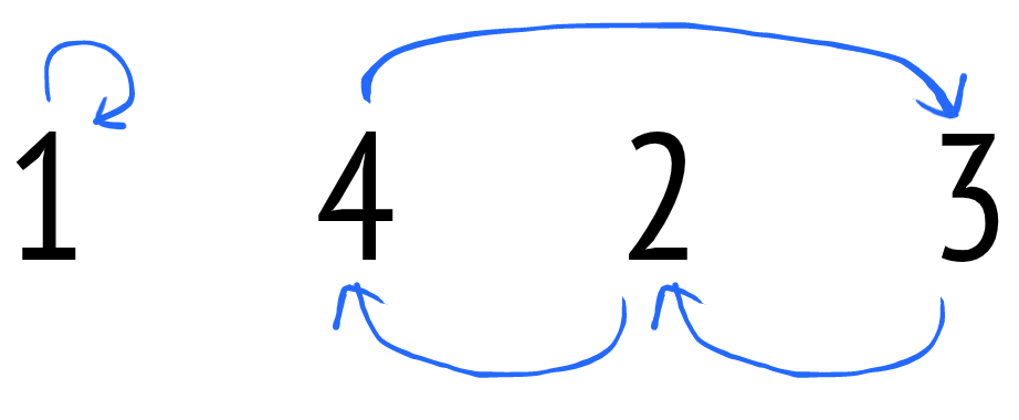 예를 들어 배열의 요소가 2, 5, 3, 1이라고 해 봅시다. 그렇다면 1은 2로 가야하고, 2는 5로 가야하고, 5는 3으로 가야하고, 3은 제 자리에 있어야하므로 길이가 3인 사이클이 발생합니다. 그리고 선택 정렬에 의하여 1은 2로 가야합니다.