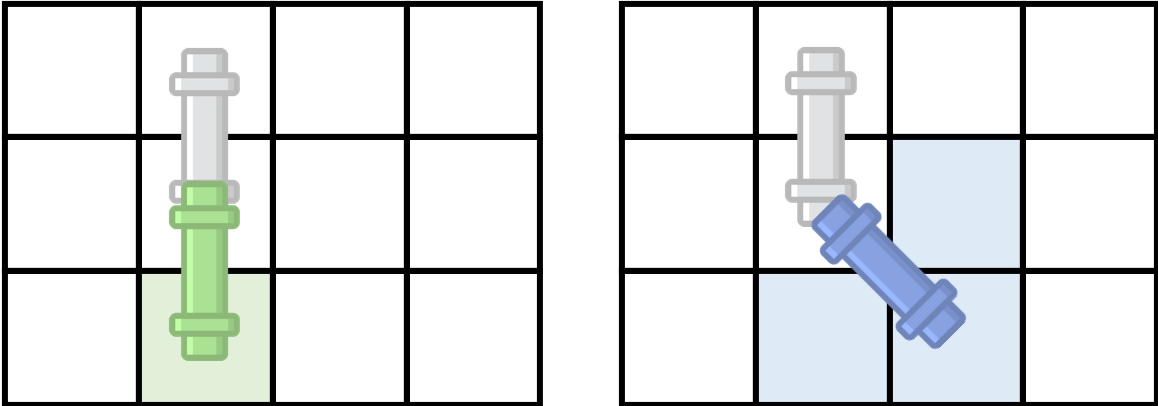 오늘은 집 수리를 위해서 파이프 하나를 옮기려고 한다. 파이프는 아래와 같은 형태이고, 2개의 연속된 칸을 차지하는 크기이다.