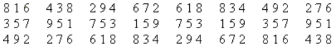 여기서 1, 3, 7, 9는 각각 3번씩 나오고, 2, 4, 6, 8은 2번씩 나오는 것을 알 수 있습니다. 그리고 가장 중요한 5는 4번 나오므로 마방진에서 중앙에 위치해야합니다. 중앙에 배치해야 가로, 세로, 오른쪽 대각선, 왼쪽 대각선에 해당하는 연산을 모두 수행할 수 있기때문이죠. 같은 이유로 5 제외 홀수는 5를 기준으로 각각 상하좌우에 배치되어야하고, 짝수는 각각 마방진의 코너에 위치해야합니다.