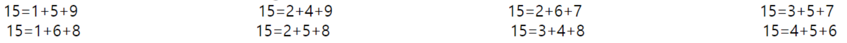 이제, 서로 다른 세 가지 수를 더해서 15가 되는 경우를 생각해 봅시다. 손으로 계산해도 되고 3중 반복문을 짜서 돌려도 좋습니다. 결과는 아래와 같습니다.