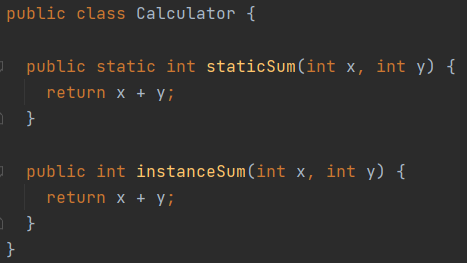 먼저, Calculator 클래스를 만들고 그 안에 동일한 작업을 하는 정적 메소드와 인스턴스 메소드를 정의하였습니다.