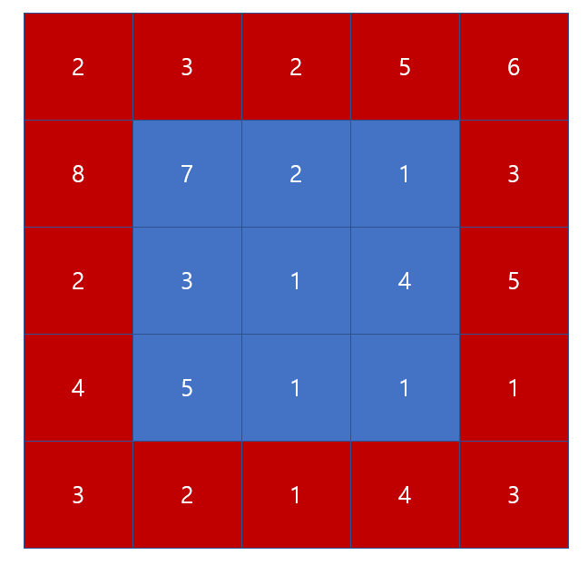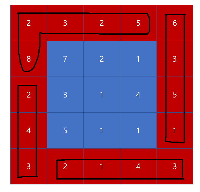 빨간색 영역을 시계 방향으로 1칸씩 밀면 아래와 같은 모습일 것입니다.