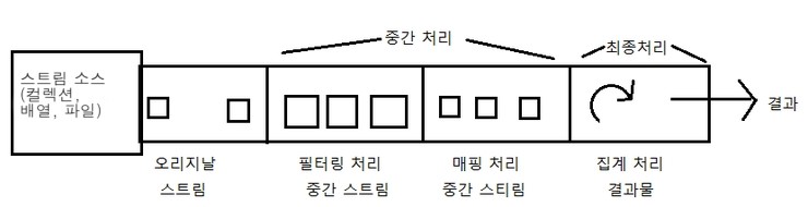 스트림은 데이터의 필터링, 매핑, 정렬, 그룹핑 등의 중간 처리와 합계, 평균, 카운팅, 최댓값, 최솟값 등의 최종 파이프라인으로 해결합니다. 여기서, 파이프라인은 컴퓨터 과학에서 한 데이터 처리 단계의 출력이 다음 단계의 입력으로 이어지는 형태로 연결된 구조를 말합니다. 최종 처리 스트림과 오리지널 스트림을 제외한 나머지 스트림은 중간 처리 스트림으로 볼 수 있습니다.
