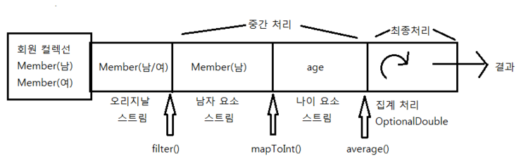 아래는 회원 컬렉션에서 남자만 필터링하는 중간 스트림을 연결하고, 다시 남자의 나이로 매핑하는 스트림을 연결한 후, 최종 남자 평균 나이를 집계하는 파이프라인을 나타낸 것입니다.