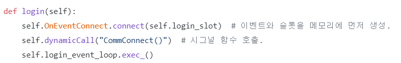 connect()는 PyQt 문법으로 이벤트.connect(슬롯) 형태로 사용하여 이벤트와 슬롯을 연결하는 역할을 합니다. dynamicCall()도 PyQt5에서 제공하는 함수로, 서버에 데이터를 송수신해주는 기능을 담당합니다. 이를 이용하여 서버에 로그인을 요청할 수 있습니다.