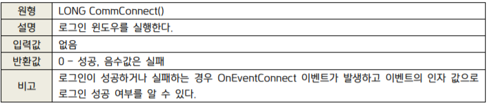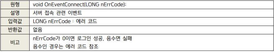 위와 같은 함수가 보이는데, 이번 시간에는 "CommConnect()"와 "OnEventrConnect(long nErrCode)" 함수만 사용할 것입니다. 그리고 KOA Studio보다는 공식 개발가이드가 각 함수의 역할을 잘 설명해주므로 2가지 함수의 설명을 자세히 봅시다.