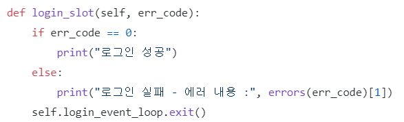 시그널 함수와 이벤트 함수는 이미 만들어진 함수로서 API에서 제공하기때문에 우리는 슬롯만 만들어서 요청 결과를 받아오면 됩니다. 저는 로그인 슬롯의 이름을 login_slot라고 지었고, OnEventConnect()의 요청 결과를 어떻게 이용하였는지 보겠습니다.
