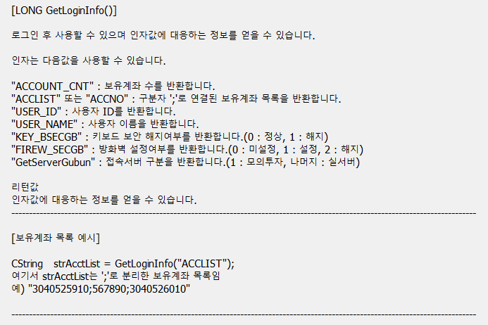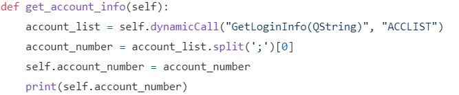 GetLogininfo() 함수는 인자를 하나 요구하고, 인자 값에 따라 반환하는 데이터가 달라집니다. 우리는 계좌 번호가 필요하므로 "ACCLIST" 혹은 "ACCNO"를 인자로 넘기고, 전체 계좌를 적절하게 split해서 하나의 계좌만 반환하면 됩니다.