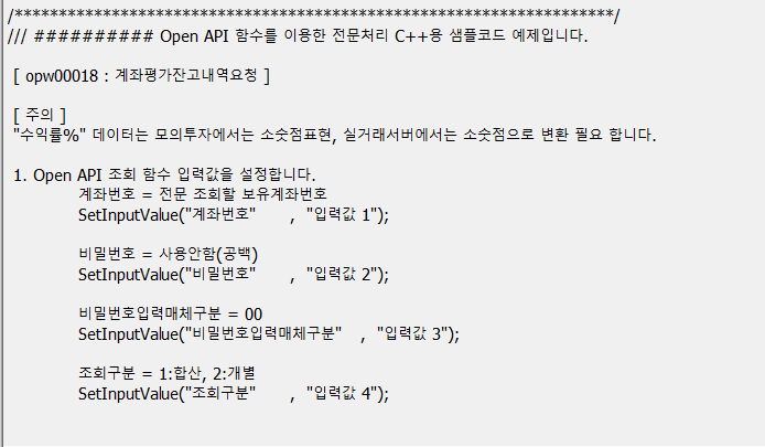 저번 시간에는 예수금을 조회하는 소스코드를 작성하였습니다. 오늘은 계좌의 총매입금액, 총평가금액 등의 데이터를 얻어오는 과정을 구현해 보겠습니다.