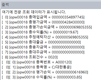 그러면 다양한 데이터가 출력되는데, 싱글 데이터는 [0] ~ [8]까지이고, 그 밑에는 모두 멀티 데이터입니다. 멀티 데이터는 다음 시간에 다룰 것이니 패스하고, 싱글 데이터 중에서 우리는 총매입금액, 총평가금액, 총평가손익금액, 총수익률(%)만 뽑아낼 것입니다.