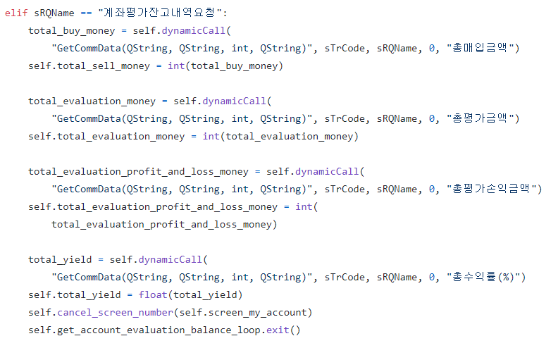 tr_slot() 함수에서 '예수금상세현황요청' 코드 아래에 elif를 추가한 것입니다. GetCommData 함수를 사용하여 총매입금액, 총평가금액, 총평가손익금액, 총수익률(%) 데이터를 얻어오면 됩니다. 단, 이 값들 중 총수익률(%)은 반드시 int가 아닌 float로 형변환해 주셔야합니다.