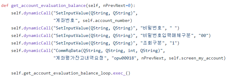 먼저, SetInputValue() 함수와 CommRqData() 함수를 다루는 get_account_evaluation_balance() 함수를 정의하였습니다. 예수금 조회의 입력값과 동일하기때문에 SetInputValue() 함수는 그대로 복붙을 하였고, CommRqData() 함수의 입력값에서 트랜잭션에 대한 값만 변경하였습니다.