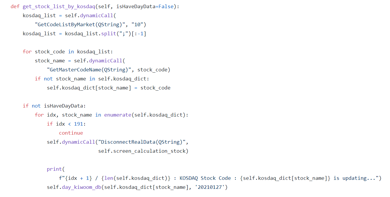 인자가 isHavaDayData라는 것이 추가되었는데, 이것이 False면 일봉 데이터를 DB에 저장하는 작업을 합니다. 그리고 그 전에 코스닥 딕셔너리를 정의하는데, key는 종목의 이름, value는 종목의 코드가 되겠습니다. 또한, 굳이 코스닥 전체 종목 코드를 분리할 필요는 없어 보여서 기존의 있던 함수를 제거하였습니다.