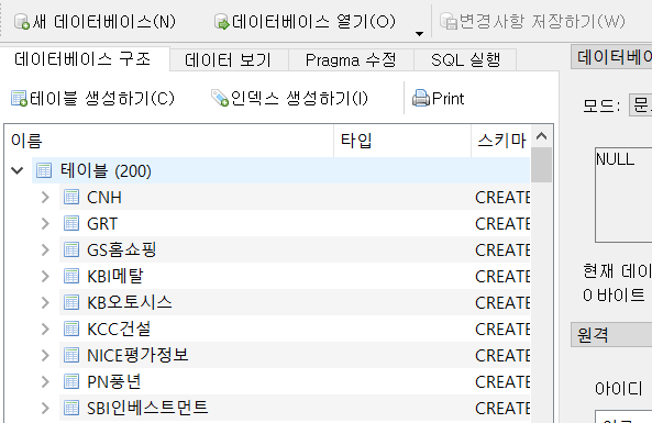 그리고 그 아래 쿼리문인 "SELECT name FROM sqlite_master WHERE type='table'"은 DB에 있는 테이블의 목록을 뽑아내는 것입니다. 이를 이용하여 테이블에 동일한 종목 이름이 들어가지 않도록 하였습니다.