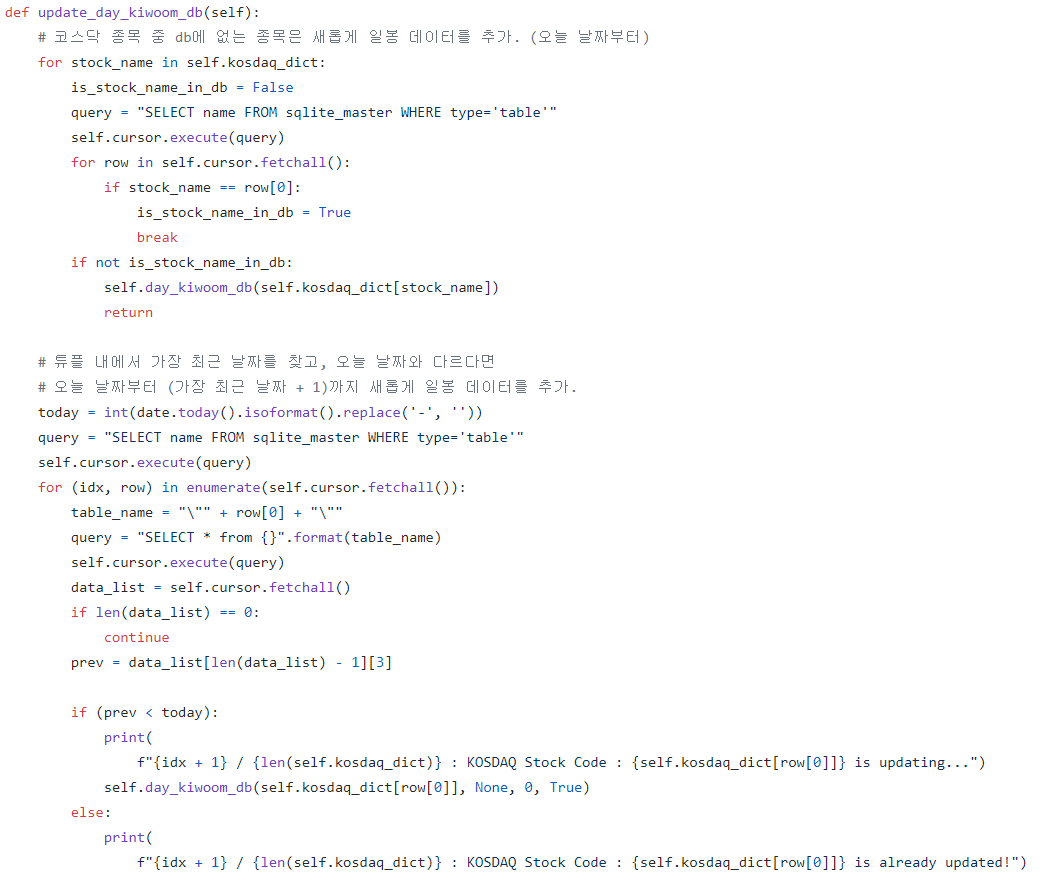 먼저, 가장 핵심이 되는 함수입니다. 처음에는 테이블 내의 해당 종목이 존재하는지 확인하고 그 종목을 추가해 주고 일봉 데이터를 넣어 줍니다. 해당 종목이 존재한다면 오늘 날짜의 일봉 데이터가 없을 경우에만 새롭게 일봉 데이터를 업데이트해 주어야 합니다. 이때, 오늘 날짜를 구하기 위해서 date 모듈을 사용하였습니다. today() 함수를 이용하여 date 객체를 얻어오고, isoformat() 함수를 통해 "2021-01-30"와 같은 문자열 형태로 받아올 수 있습니다. 그리고 튜플 내의 날짜 데이터는 '-'이 없는 '20210127'과 같은 int 형태이므로 '-'을 제거해 줍니다. 이후에 튜플 내의 날짜 데이터 중 가장 최신 날짜와 오늘 날짜와 비교해서 오늘 날짜가 더 나중이라면 일봉 데이터를 업데이트하면 됩니다. 그리고 이때, day_kiwoom_db() 함수를 호출합니다.