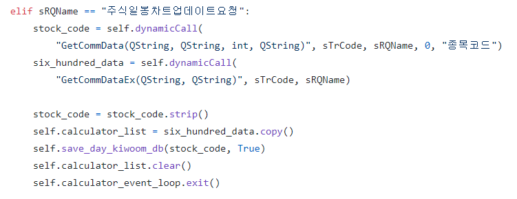 여기서 GetCommDataEx() 함수를 통해 최대 600일 간의 일봉 데이터를 얻어오고, 그 리스트를 self.calculator_list에 넘겨준 뒤, save_day_kiwoom_db() 함수를 호출합니다.