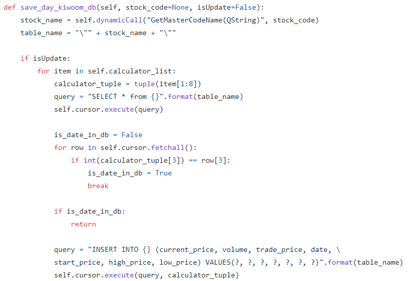 save_day_kiwoom_db() 함수도 isUpdate 인자를 추가하였고, 이것이 True일 경우에만 DB에 데이터를 다르게 추가합니다. 먼저, calculator_tuple을 보면 item[1:8]로 slice를 취했는데, 이것은 GetCommDataEx() 함수를 통해 얻어낸 2차원 리스트가 8번째 인덱스이후로는 쭉 빈 문자열이기 때문입니다. (각각의 요소의 길이는 참고로 15입니다.) 그리고 튜플 내의 날짜 데이터가 중복되는 순간에는 함수를 종료하도록 설계하였습니다.