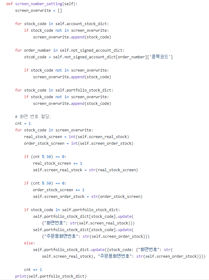 포트폴리오 파일에서 읽어온 self.portfolio_stock_dict를 정의하였고, 종목별 할당할 화면 번호 두 종류를 정의하였습니다.
